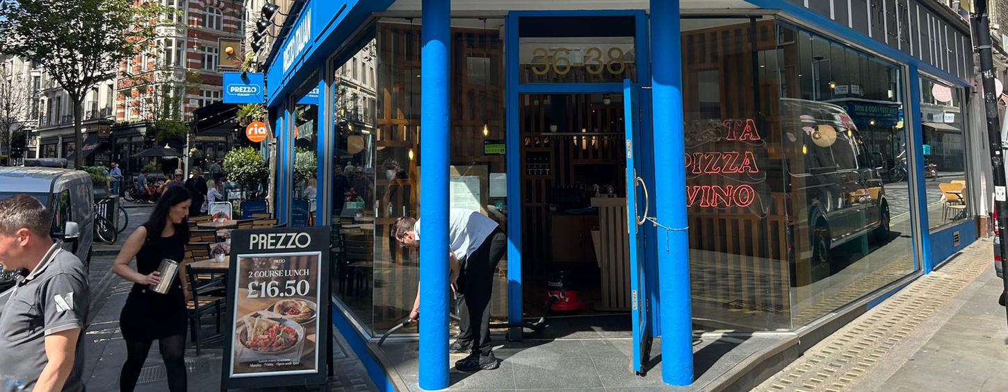 This transformational, front elevation shows the power of great branding, showing old vs new. With traditional, hand painted signage and a general colour change to the front of Prezzo Italian in Soho, London.
